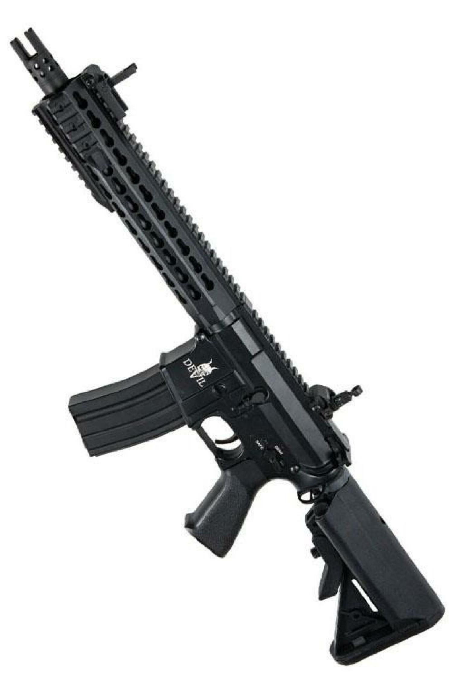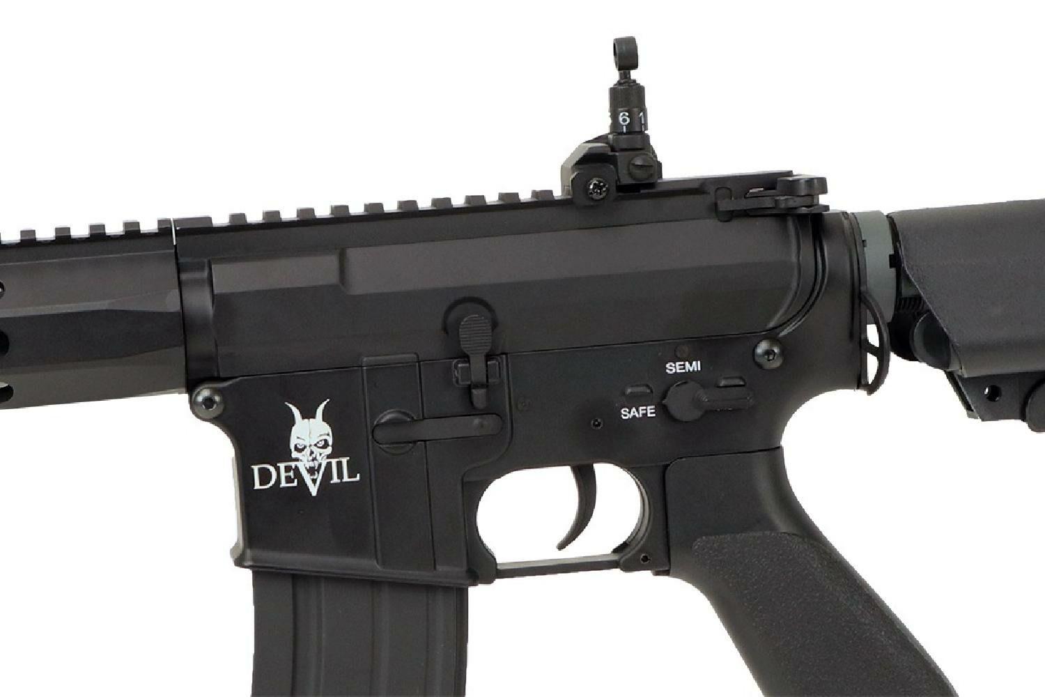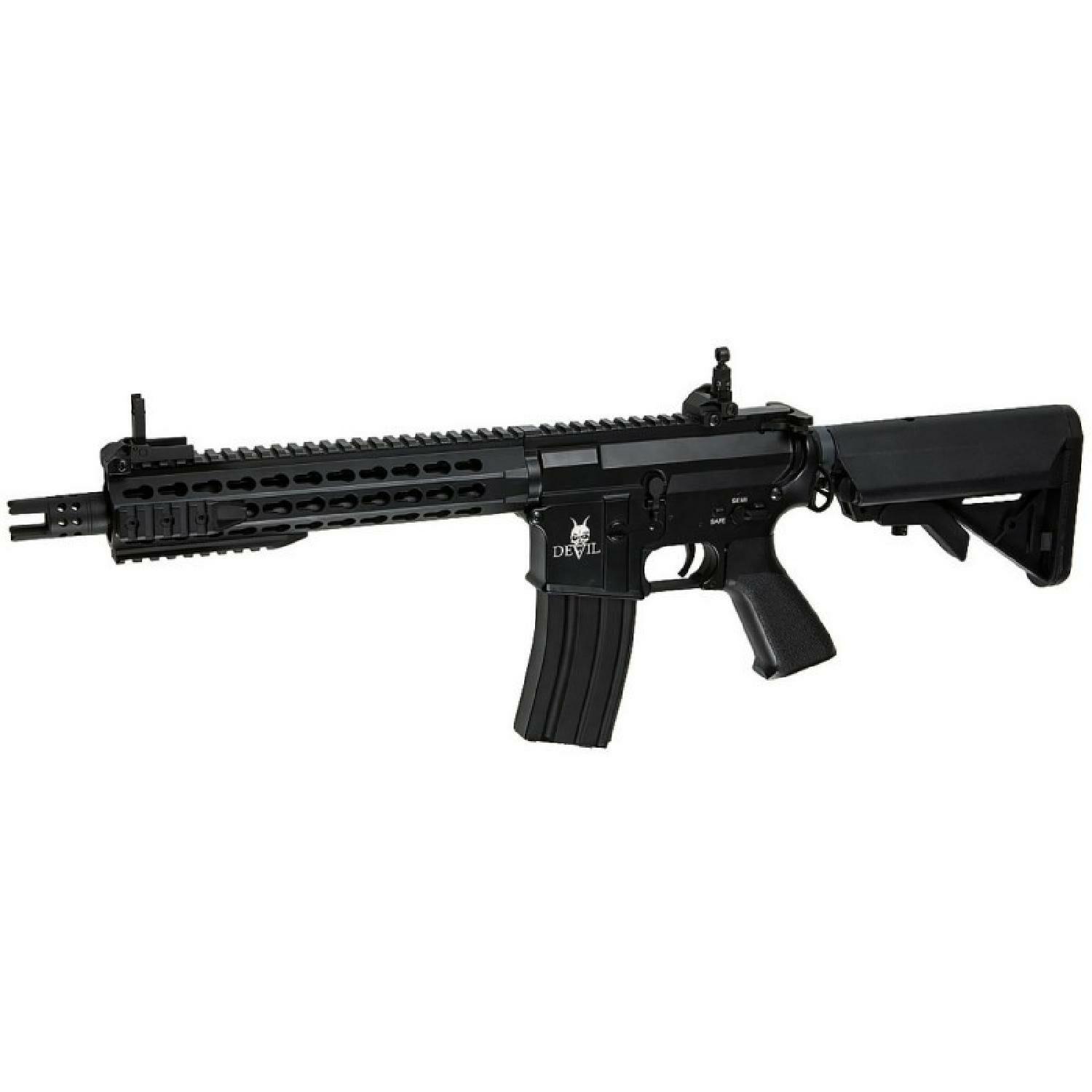 ASG M15 DEVIL Carbine 10”, modern tasarımı ve KeyMod ön el kundağıyla her tür taktik görev için mükemmel bir seçimdir. DEVIL serisi, klasik M4 görünümlerinden sıyrılarak hem dış tasarımı hem de iç mekanizmasıyla fark yaratır. MIM çelik dişliler, 8 mm rulmanlı gearbox, metal piston kafası ve kolay yay değişimi özelliği ile performans açısından üst seviyede bir deneyim sunar.