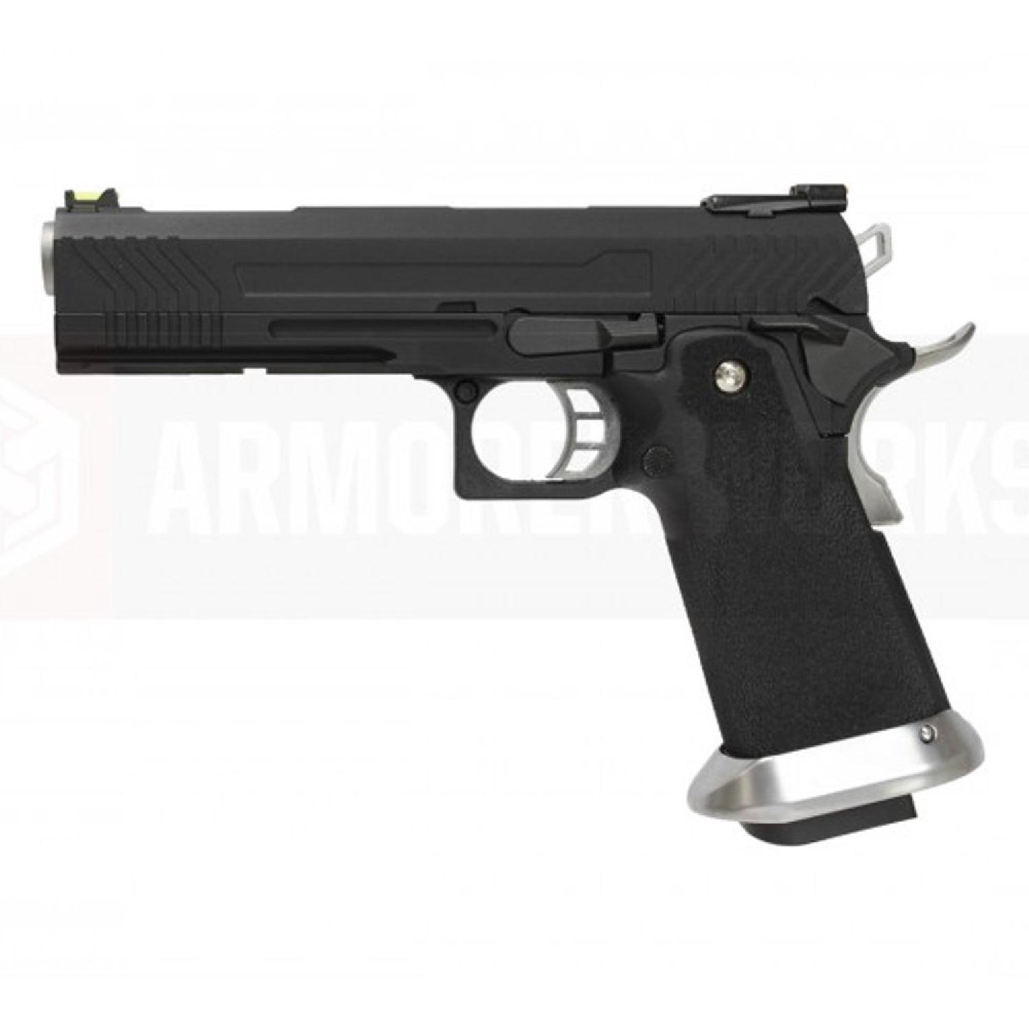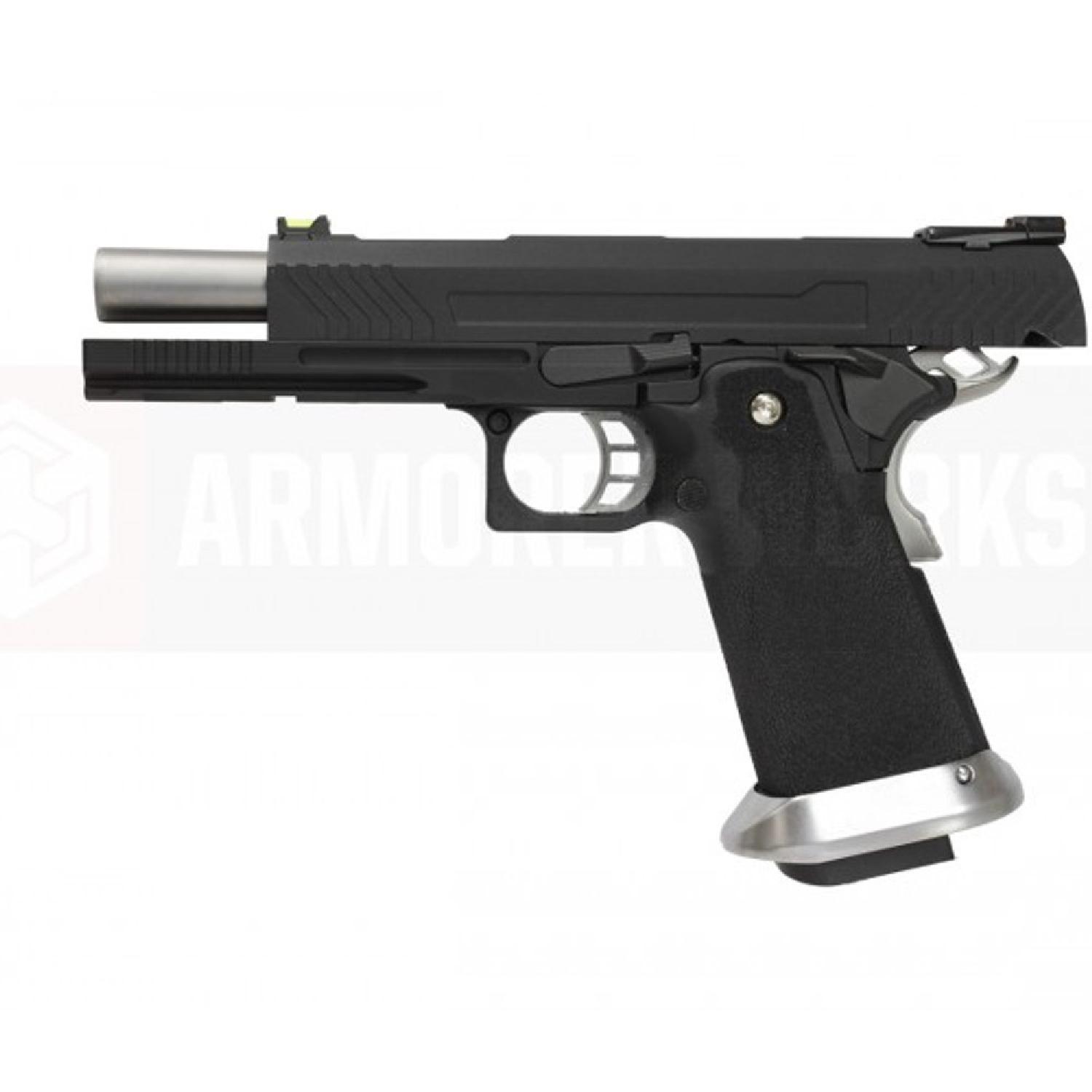 Armorer Works’un özel yapımı Hi-Capa Competition Grade GBB Airsoft Tabanca, fabrika çıkışlı upgrade edilmiş birinci kalite ürünler sunuyor. Full metal sürgü, fiber kabza, fiber optik nişangahlar ve gerçekçi Blowback özellikleriyle performansı en üst düzeye çıkarılmış bu tabanca, hızlı yükleme sağlayan magwell ve konforlu kullanım sunan ergonomik tasarımıyla dikkat çekiyor. Bu tabanca, Airsoft tutkunları için mükemmel bir seçim olabilir.