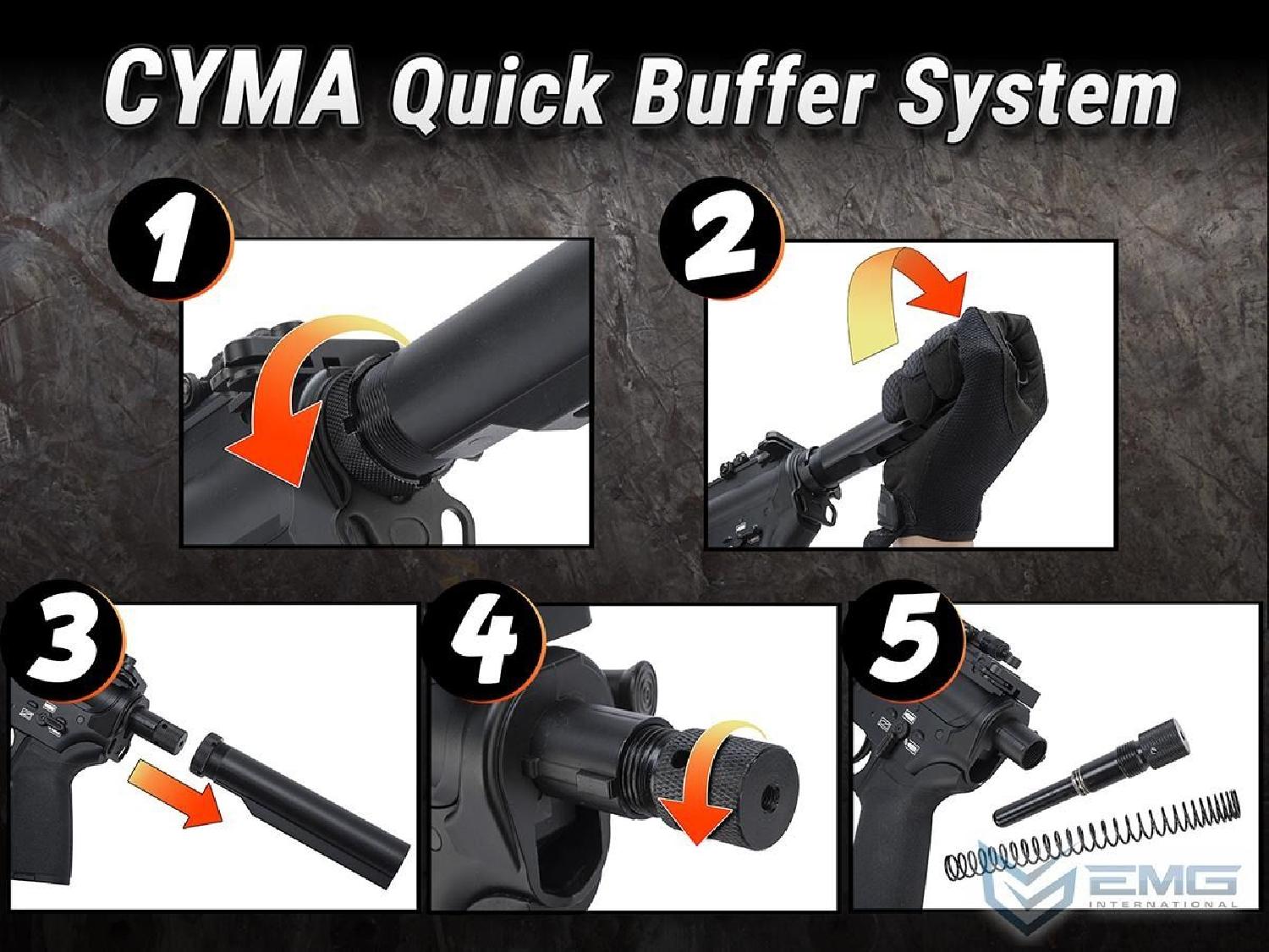 CYMA serisine yeni eklenen Quick Buffer System (QBS), elle hızlı yay değişimlerine imkan tanır. Bu verimli yeni sistem, yakalanmış kılavuz çubuğa ve yaya erişim için sadece buffer tüpü üzerindeki somunu çıkarmanızı gerektirir. Yay değiştirmek için alıcı gövdeyi açmaya ya da dipçiği buffer tüpünden çıkarmaya artık gerek yoktur.