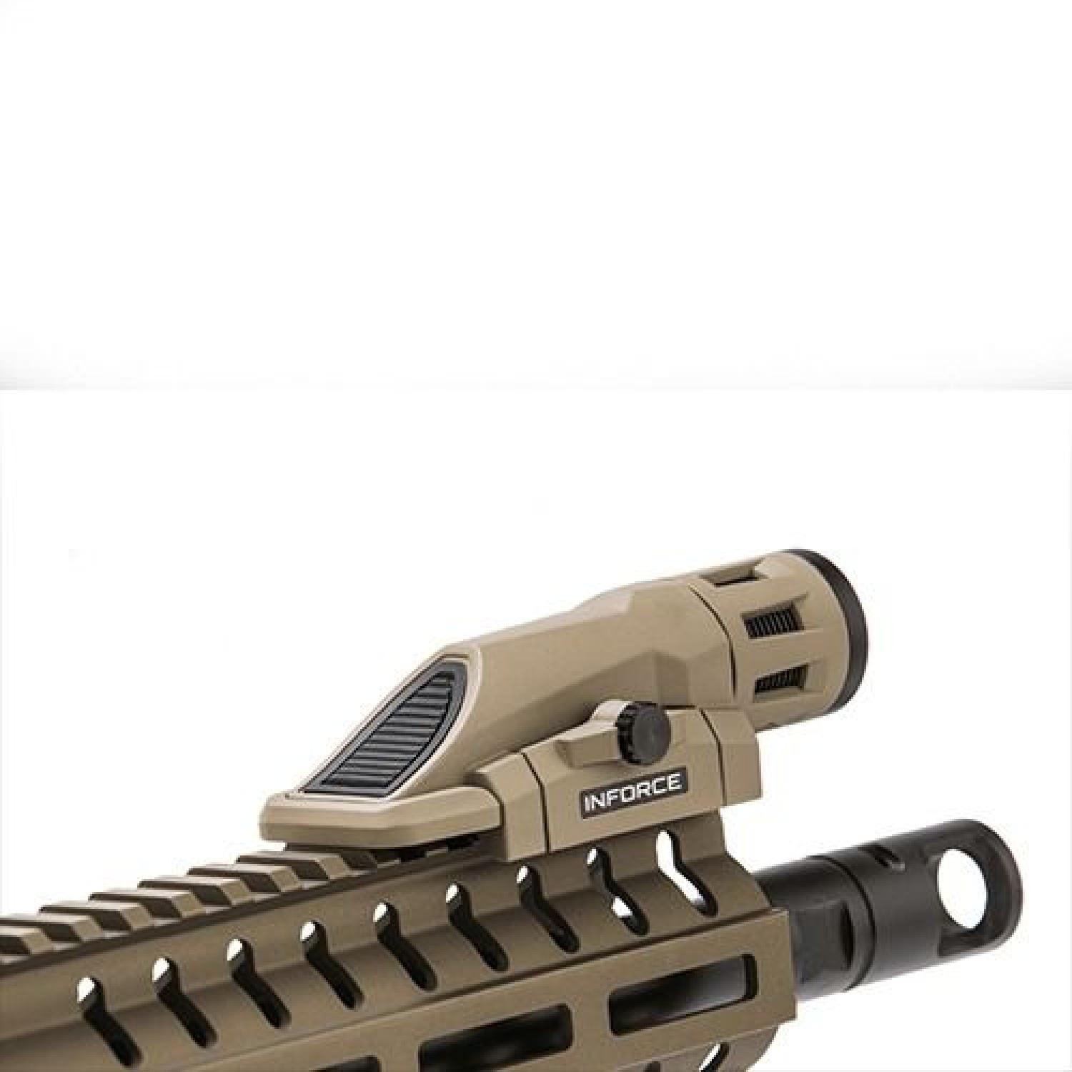 Inforce WML Silah Feneri, 400 lümen ışık çıkışı, beyaz ışık huzmesi, 126 metre (413 ft) ışık menzili, LED ampul, cam lens, kaymaz anahtar, güvenlik mandalı, 1 adet CR123A pil, entegre kelepçe, takviyeli naylon malzeme, Flat Dark Earth (FDE) renk, 20 metre (66 ft) suya dayanıklılık, 10.6 cm (4.2”) uzunluk, 2.54 cm (1”) çap ve 90 gram (3.2 oz) ağırlığa sahiptir.