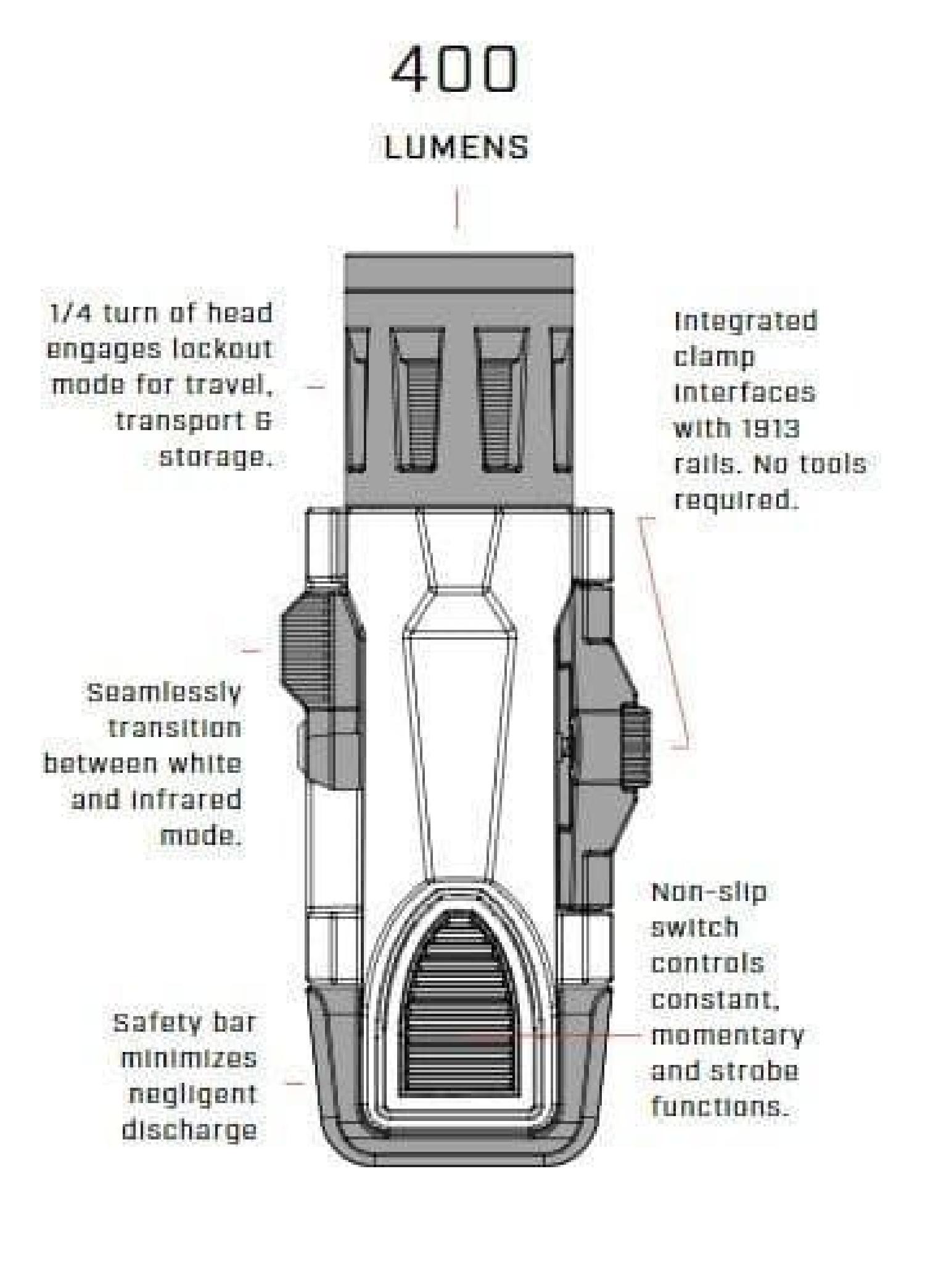 Takviyeli naylon gövde ve FDE renkli bu WML Beyaz Işık modelinde, kazara açılmayı önleyen bir güvenlik mandalı ve patent başvurusu yapılmış, kompakt, kullanışlı ve sağlam entegre ray kelepçesi bulunur. Bu kelepçe, MIL-STD-1913 rayları ile uyumludur ve herhangi bir alete ihtiyaç duymaz.