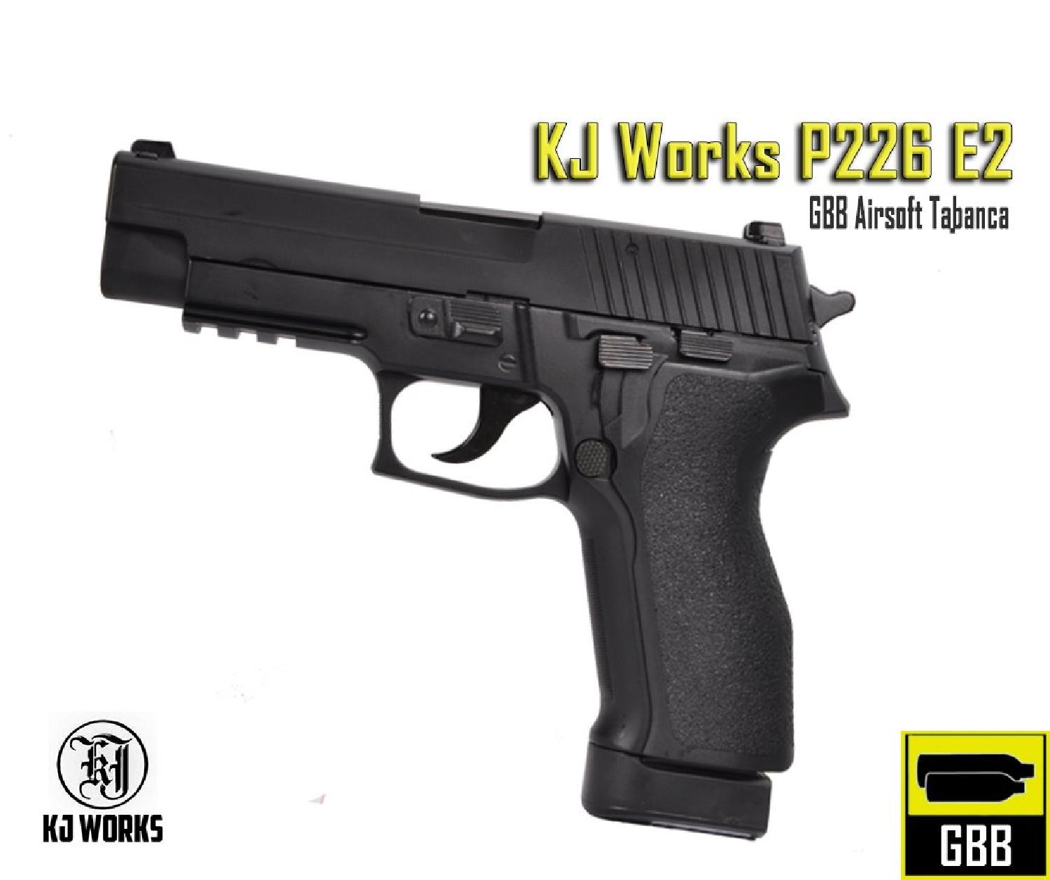 KJW P226 E2 GBB tabanca, sadece yeni tasarım kaymaz E2 kabzasıyle KJW KP01’in yeni versiyonudur.