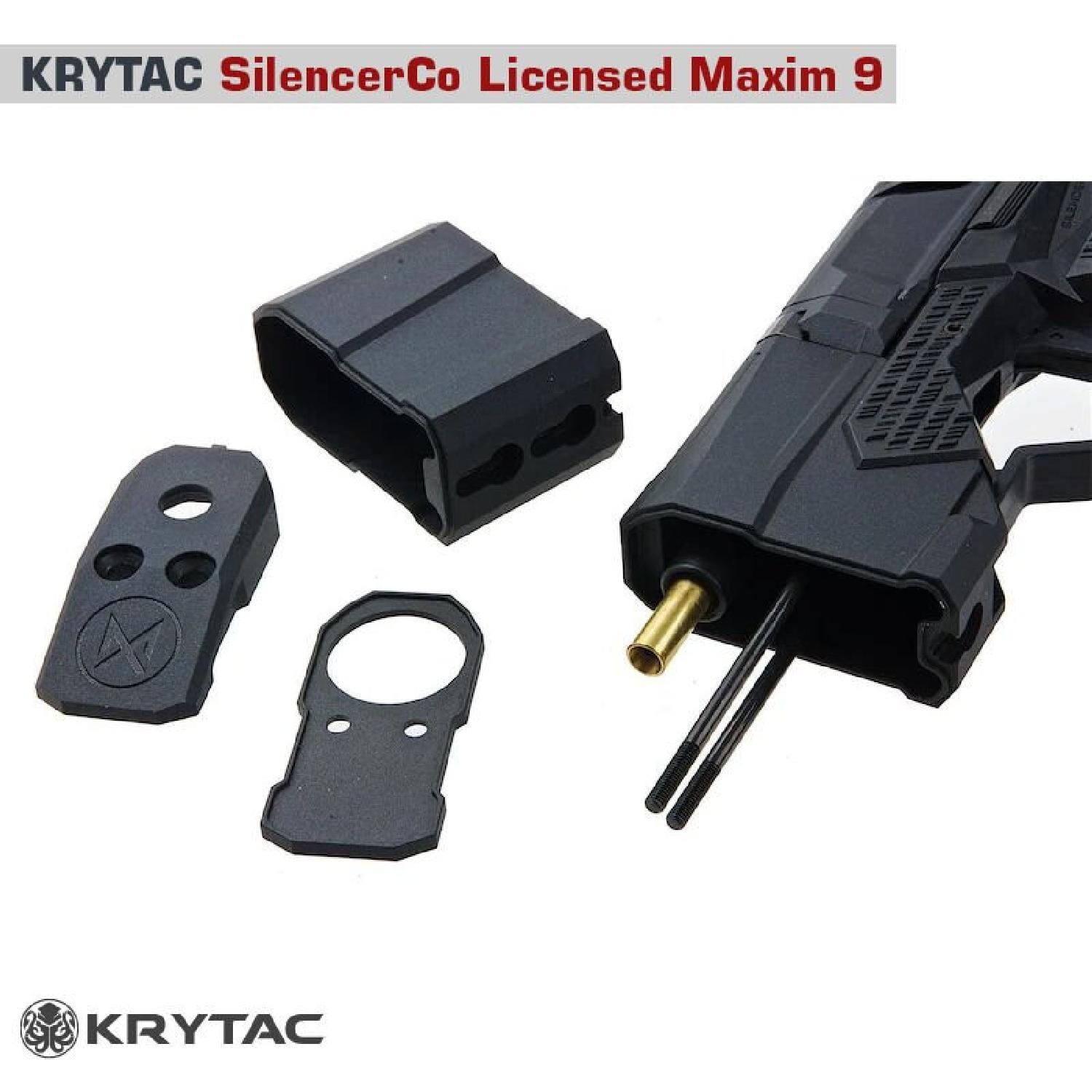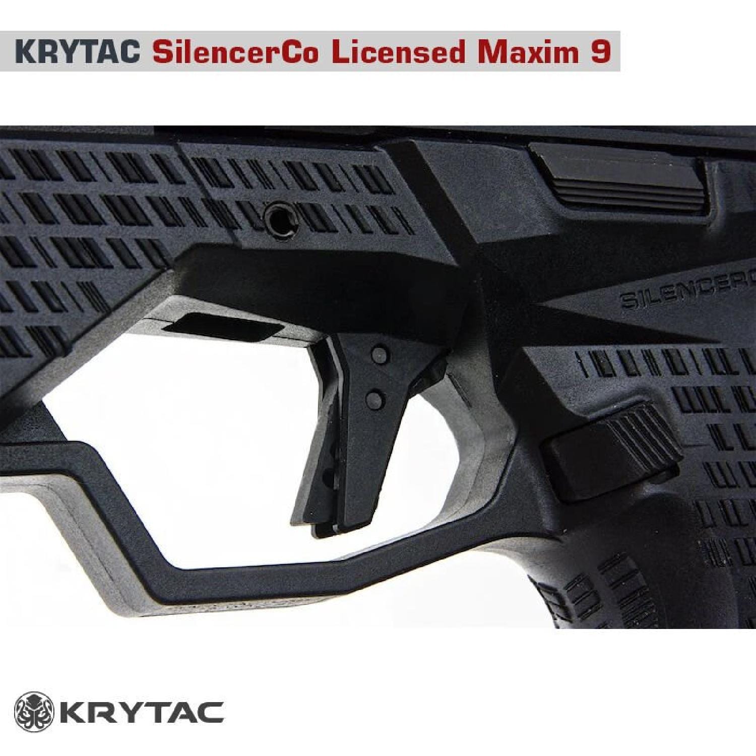 Dünyanın önde gelen premium performans airsoft replikaları üreticisi KRYTAC, SilencerCo ile yaptığı özel lisans anlaşmasıyla ünlü Maxim 9 entegre susturuculu tabancasının airsoft versiyonunu üretmiştir. SilencerCo Maxim 9, 2017 yılında tanıtılan dünyanın ilk entegre susturuculu 9mm tabancasıdır ve tüm mühimmat türleriyle kulak koruması gerektirmeden kullanılabilir. KRYTAC, bu yenilikçi tabancayı 6mm BB atan, green gas veya CO2 ile çalışan, geri tepme özellikli airsoft tabancası olarak sadık biçimde üretmiştir.