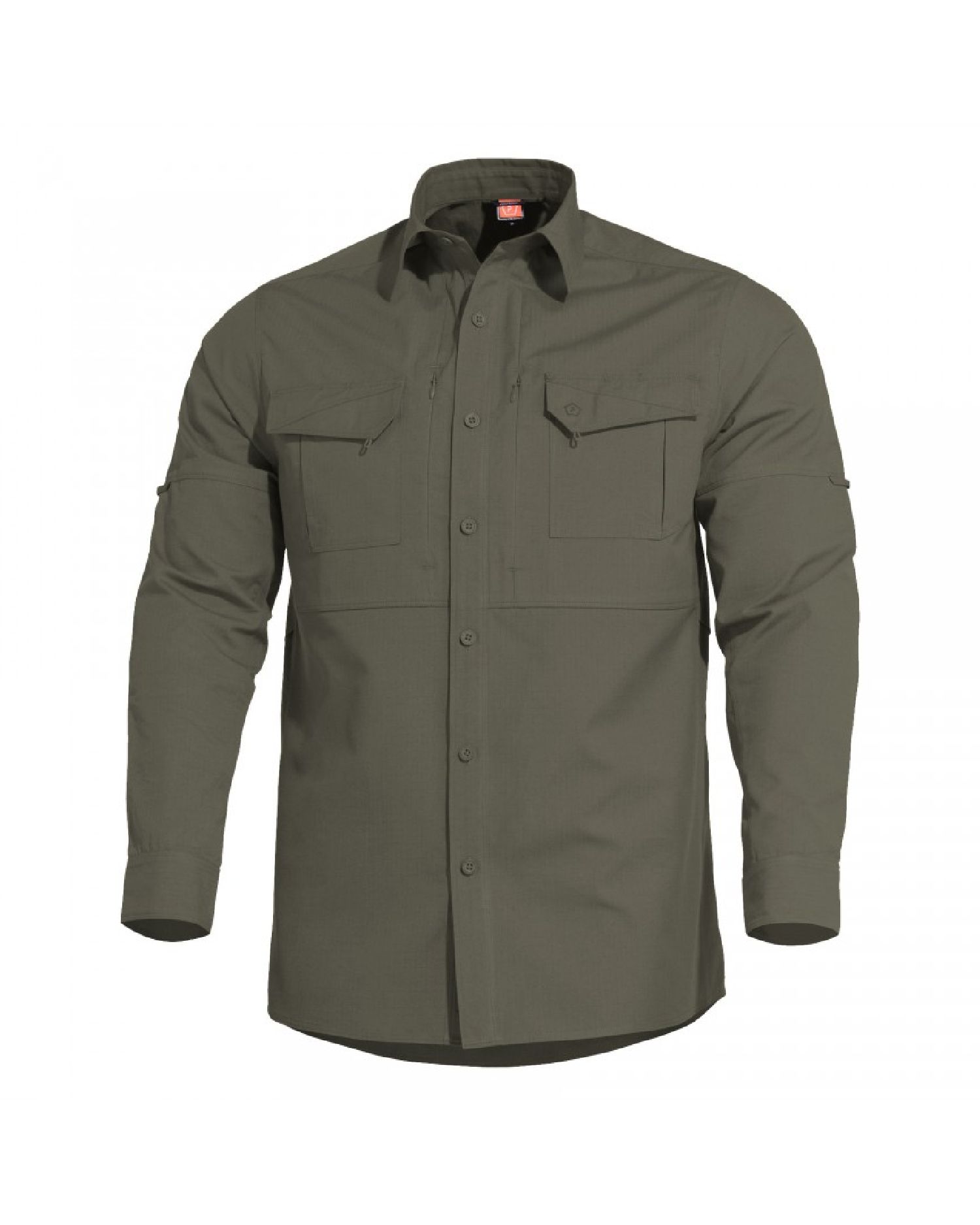 Bu hafif, düşük profilli görünümlü gömlek, klasik yakalı düğmeli ön, yuvarlak manşetli kıvrılabilir kollar, cırt cırtlı kapaklı ve kalem yuvalı iki ön genişletilebilir cep ve iki YKK gizli fermuarlı ön cep içeriyor.