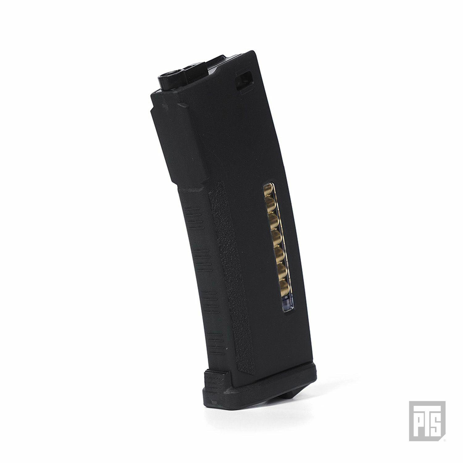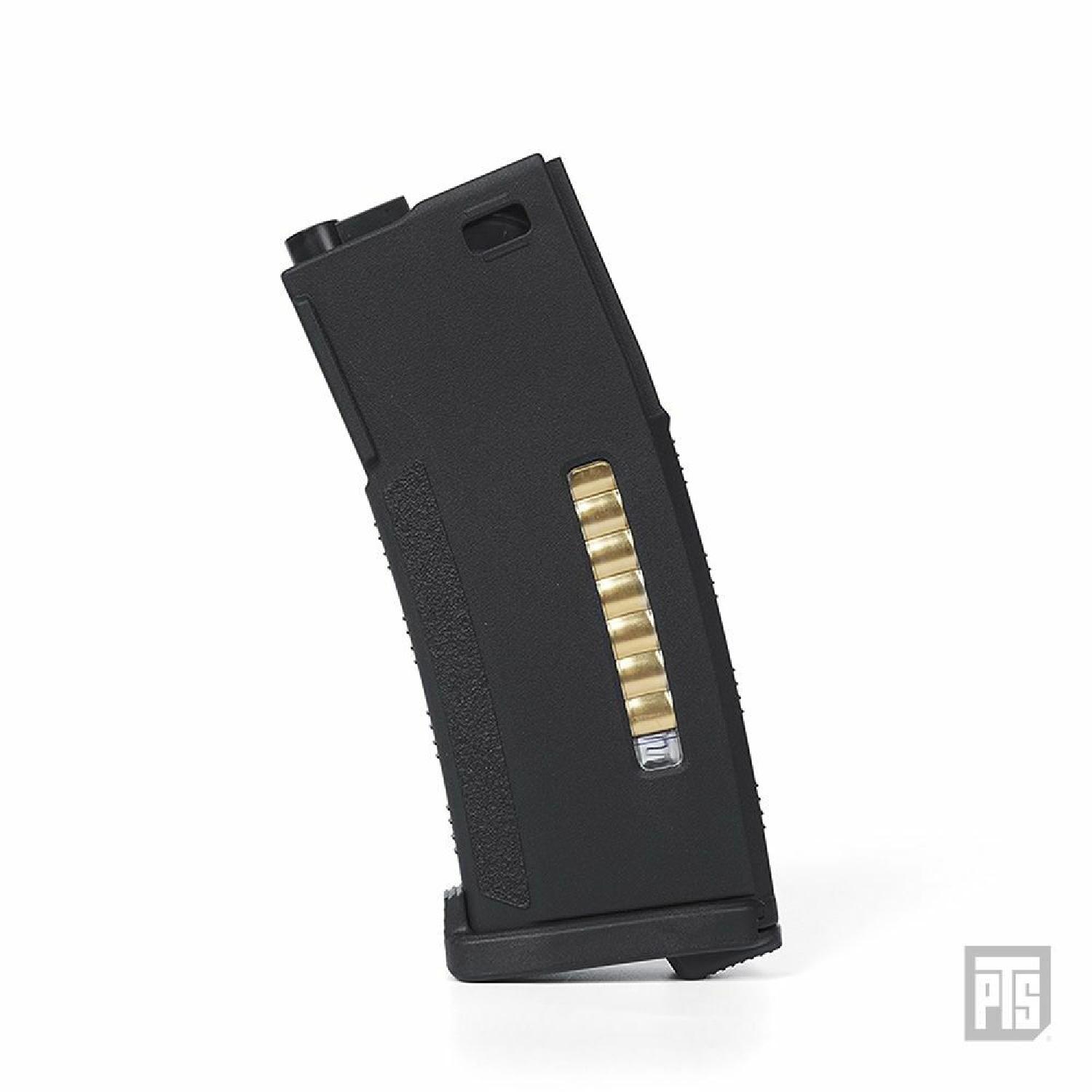 PTS Enhanced Polymer Magazine (EPM), airsoft AEG’ler için orta kapasiteli polimer şarjörlere yeni bir yaklaşım getiriyor. Dupont Zytel Polimerden üretilen bu şarjör, oldukça dayanıklı ve sağlam bir ağırlığa sahip. Gömülü paneller, daha iyi bir tutuş sağlarken, benzersiz şarjör yuvası kılavuzları, şarjörün çekilmesi veya kılıflara tekrar takılması sırasında tutuklanma olasılığını azaltıyor. Mermi penceresi, gerçekçi görünümlü sahte 5.56 mm fişekler içeriyor ve şarjörün dolu olduğunu gösteren görsel bir göstergeye sahip (şarjör tamamen dolduğunda turuncu takipçi görünür).