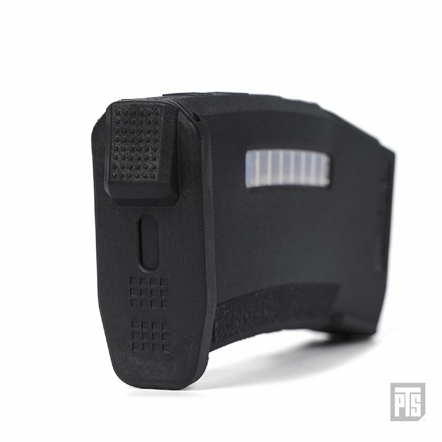 Taban plakasının alt kısmı, kullanıcının silahı herhangi bir düz atış yüzeyine dayayabilmesi ve daha fazla temas yüzeyi ile atış stabilitesini artırabilmesi için açılı bir yüzeyle tasarlanmıştır. Bu açılı yüzey, fonksiyonel olacak şekilde minimize edilmiş, ancak kılıftan çekildiğinde elde rahatlık sağlar ve kapaklı üst şarjör kılıflarının kapanmasını engellemez. Taban plakasının ön kısmı, derin şarjör kılıflarından çıkarılmasını kolaylaştıran oluklu bir çıkıntı ile tasarlanmıştır ve kullanıcının şarjörü doğru şekilde yerleştirmesine yardımcı olur. Nokta matrisi deseni, şarjörün kişiselleştirilmesi ve tanımlanması için uygundur.