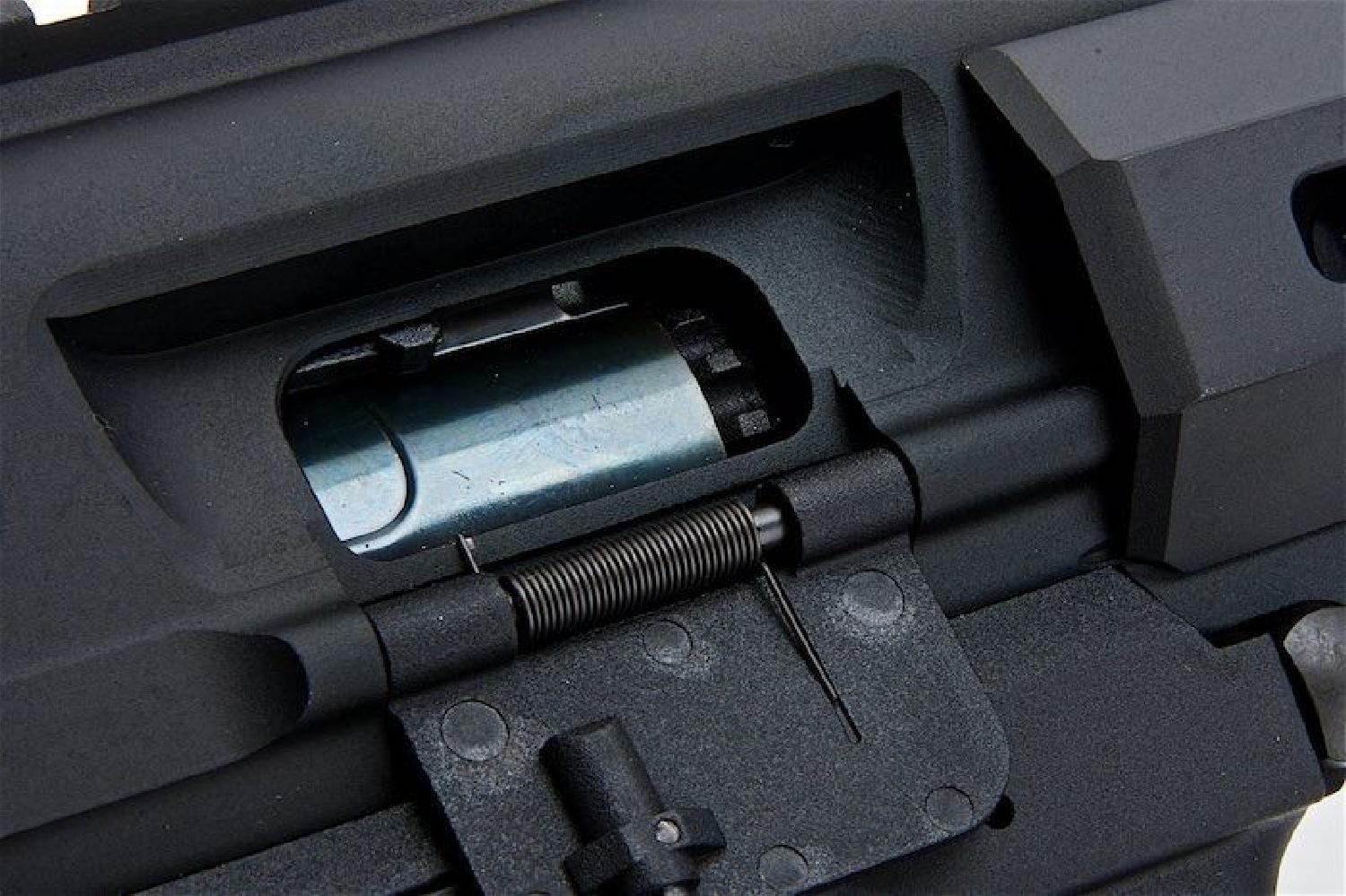 - Her iki el ile kullanılabilen şarj kolu, gerçekçi çift geri dönüş yaylarıyla; sahte bolt, hopup ayarına kolay erişim için geri kilitlenir (fonksiyonel bolt stop)