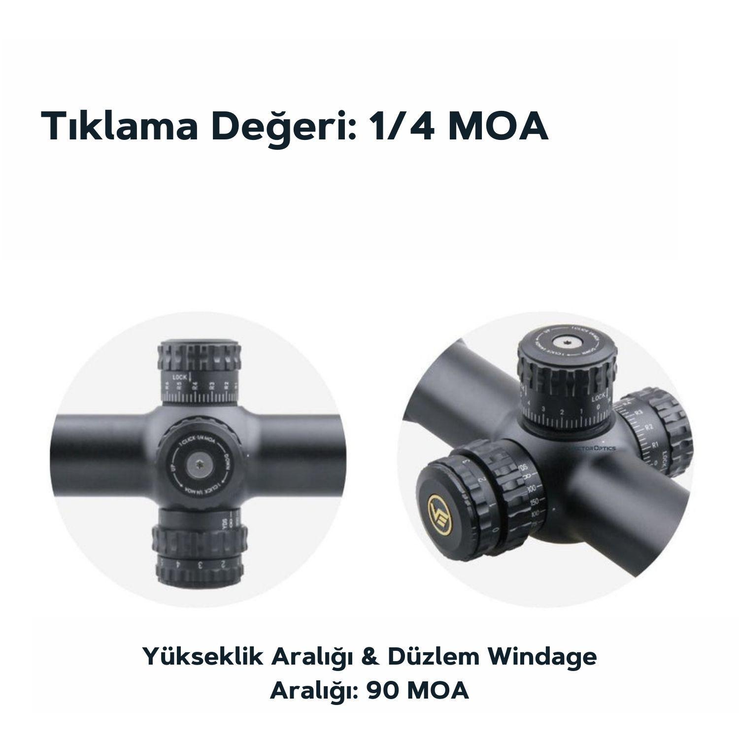• 1/4 MOA Ayar Hassasiyeti, sıfırlama resetleme ve kilitlenebilir kule özellikleri ile birlikte gelir. Toplamda >90 MOA ayar aralığına sahiptir.