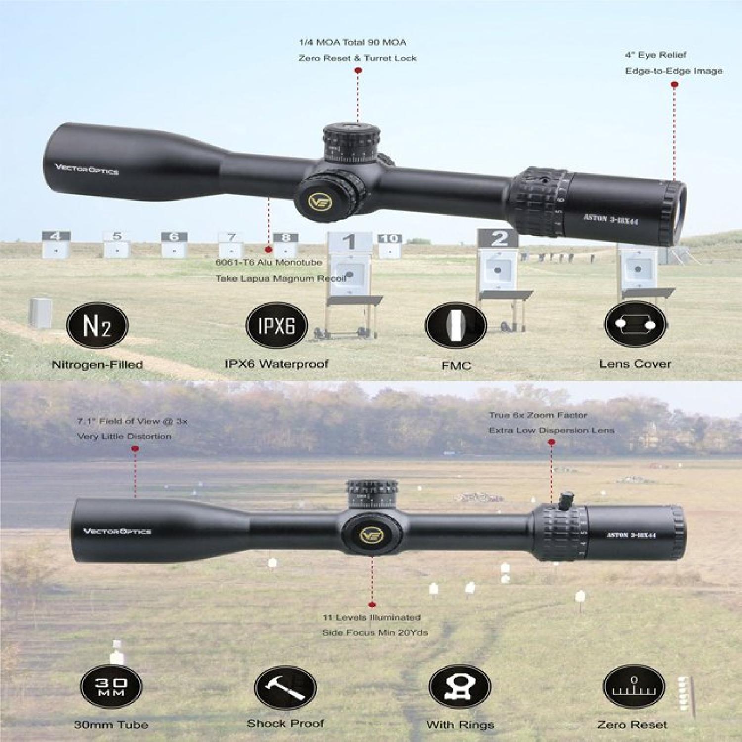 • 30mm Tek Parça Gövde, 6061 T6 alüminyumdan üretilmiştir, yan odaklama mesafesi 20 yarda’dan sonsuza kadar ayarlanabilir.