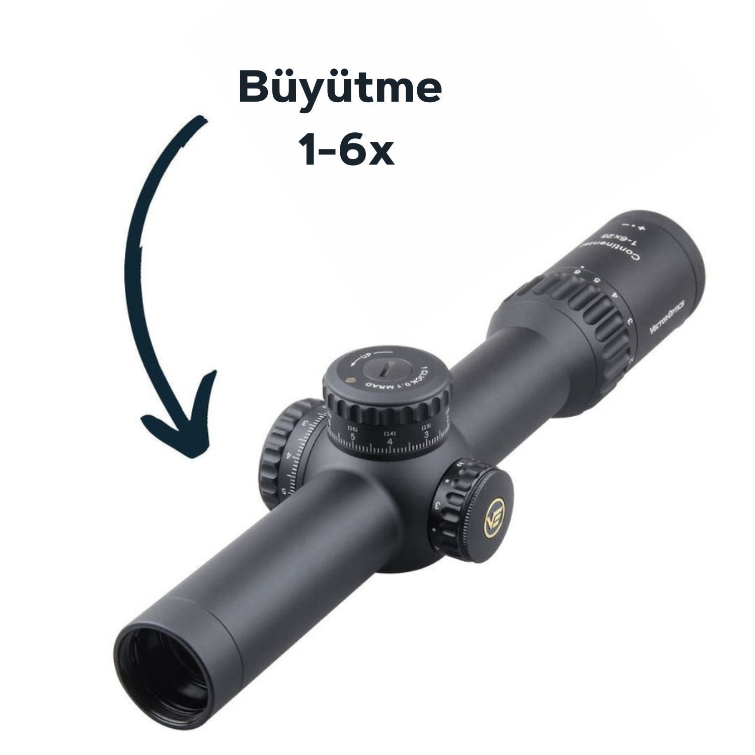 Alman Schott HT cam ve VePRO FMC kaplaması ile %90 ışık geçirgenliği sunar, net ve parlak görüntüler sağlar. Gerçek 1x büyütme özelliği, iki göz açık atışa imkan verir; 100 mm (4 inç) uzun göz mesafesi ile esnek atış pozisyonları sunar. Cam üzerine işlenmiş BDC retikül, mermi düşüşünü telafi ederek hassas atışlar yapmanızı sağlar; özellikle yarışmalar için idealdir. Sıfır noktası kilidi (Zero Stop) ile önceden ayarlanmış sıfır noktasına kolayca dönebilir, taret kilidi istenmeyen ayar değişikliklerini engeller. |