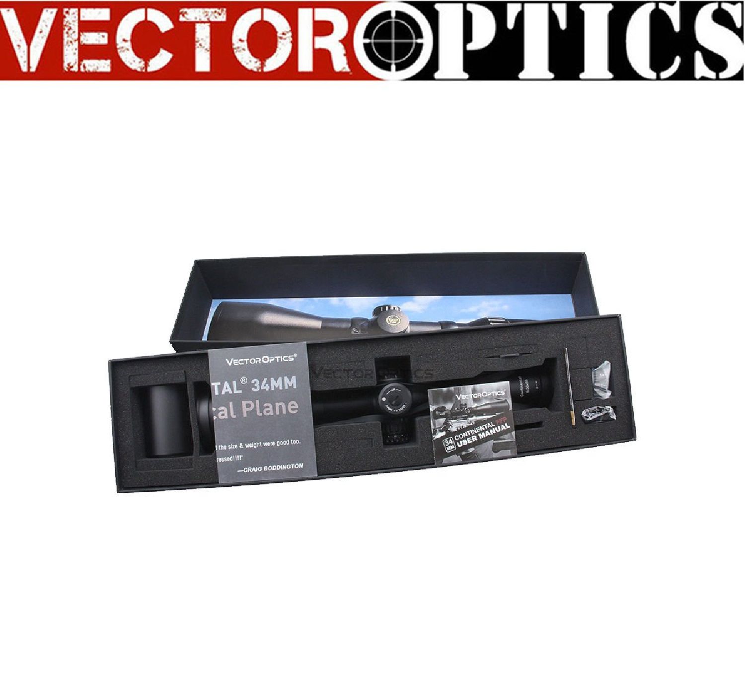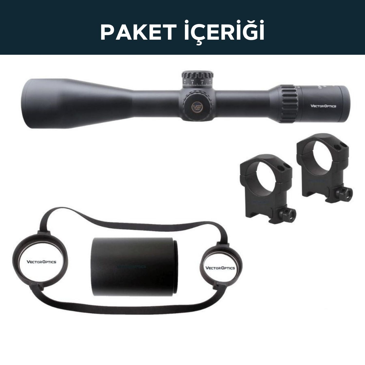 Paketteki Ürünler Bir çift 34mm Picatinny dürbün halkası, yedek yükselme taret (sıfır durdurma özelliği olmadan), güneşlik, kullanım kılavuzu, lens kapakları ve temizlik bezi