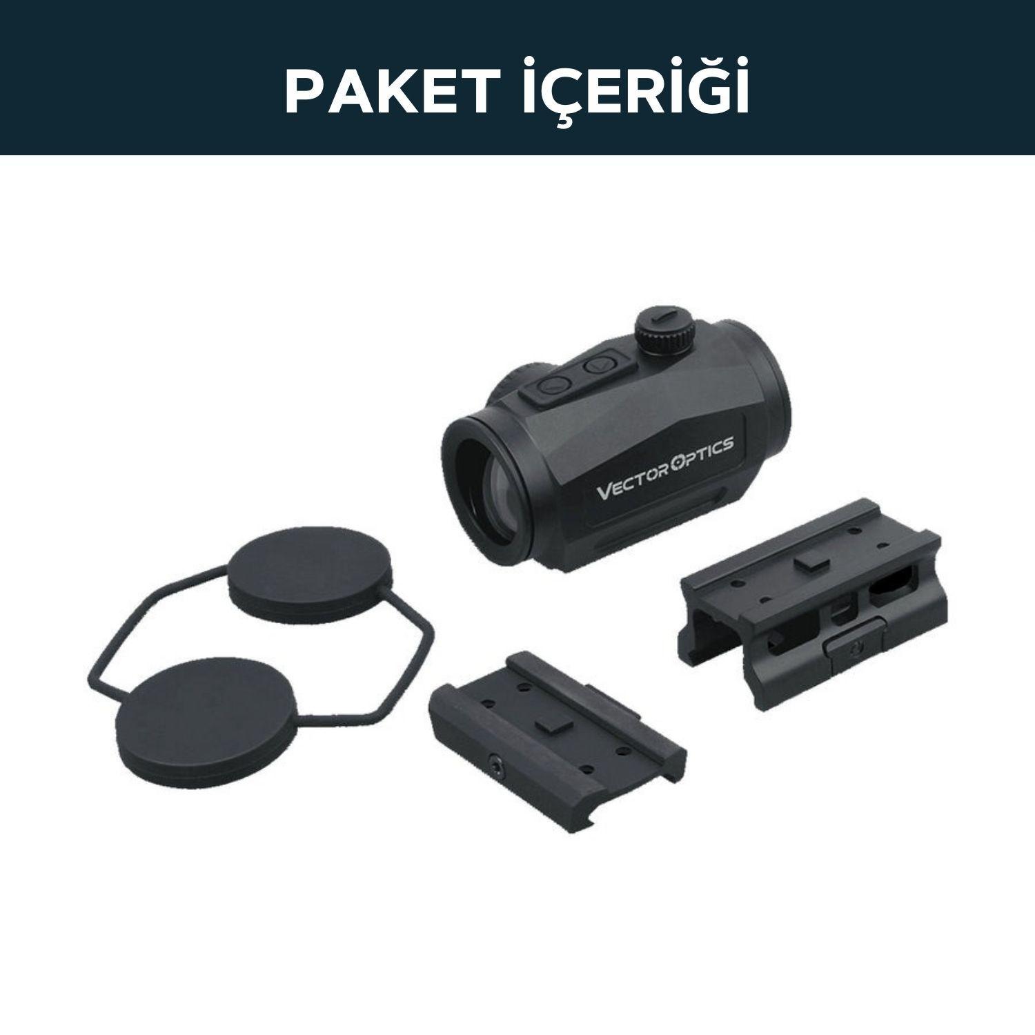 | Paketteki Ürünler | Perakende Paket, Picatinny Ray için Düşük ve Yükseltilmiş Montaj, Kauçuk Lens Kapağı, Alyan Anahtarlar ve Temizlik Bezi vb. |